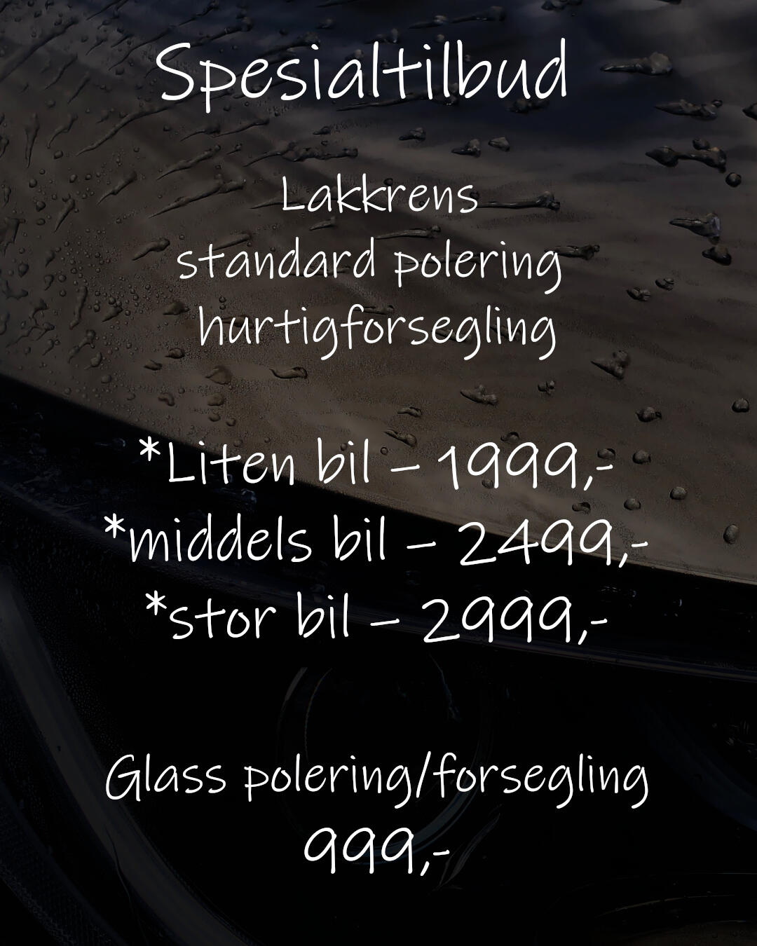 Registrer deg på venteliste og få bilen frisket opp til spesialpris. For å dekke dagens kostnader tilbyr vi spesialpris. Lav pris gir vi kun ved avbestilling eller ingen planlagte timer for dagen.Dette tilbudet er for de som ikke trenger plan, haster ikke og kan levere bilen samme dag/kveld.